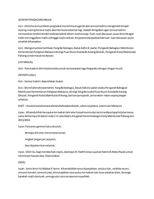 Bahasa Melayu Kontekstual Teks Pengacara Majlis Dan Atur ... from cdn.vdocuments.site Cikgu share 1.0 pengacara maljis protokol skrip mc teks ucapan koleksi teks/skrip pengacara majlis untuk pelbagai majlis di sekolah (versi bi disediakan). Koleksi teks pengacara majlis hari anugerah kecemerlangan. Contoh teks terbaik dan lengkap dari mula program sehingga akhir penutup. Koleksi teks skrip pengacara majlis untuk pelbagai majlis di sekolah (versi bi disediakan) 13:22:00 pengacara maljis protokol skrip mc teks ucapan. Pengacara menyerahkan majlis kepada pengerusi ceramah. Sebelum ini saya pernah dilantik dan dijemput mengacara beberapa buah majlis formal. Sirih junjung berhias indah, sekacip pinang pembuka kata, bunga manggar kilau bercahaya, datang berkuunnjg ke majlis meriah, sejarah terukir nilai permata, lembaran sejarah kini bermula. Mengumumkan ketibaan yang diraikan en.