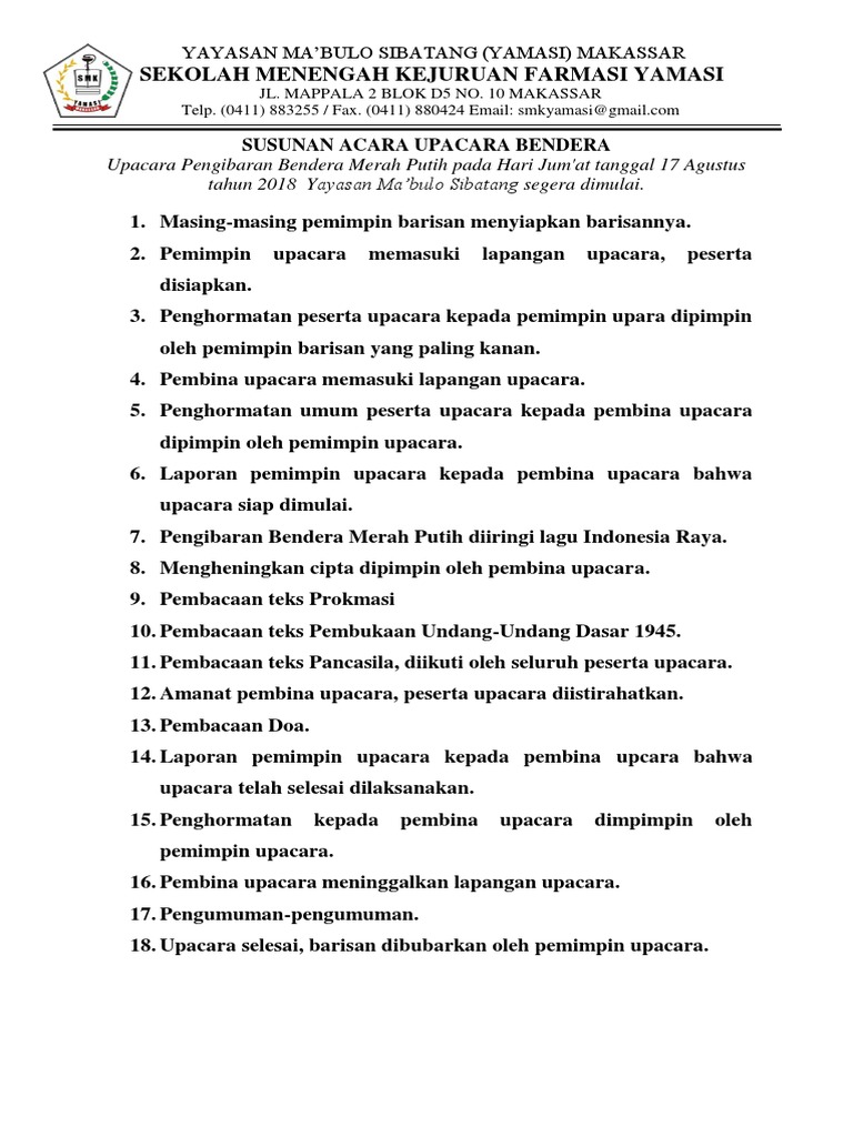 Berikut ini admin bagikan susunan acara pada saat upacara bendera di sekolah terbaru sesuai permendikbud nomor 22 tahun 2018. Susunan upacara bendera peringatan hut proklamasi ri dengan mengucapkan bismillahirrohman upacara peringatan hari ulang tahun kemerdekaan republik indonesia ke… código do wordpress. Susunan upacara bendera meliputi tiga bagian utama yaitu persiapan, pokok, dan penutup. .susunan tata upacara bendera pada tanggal 17 agustus sangatlah berbeda dengan. Dalam susunan tata upacara bendera ini admin tambahkan pembacaan janji siswa dan pembacaan visi dan misi sekolah.
