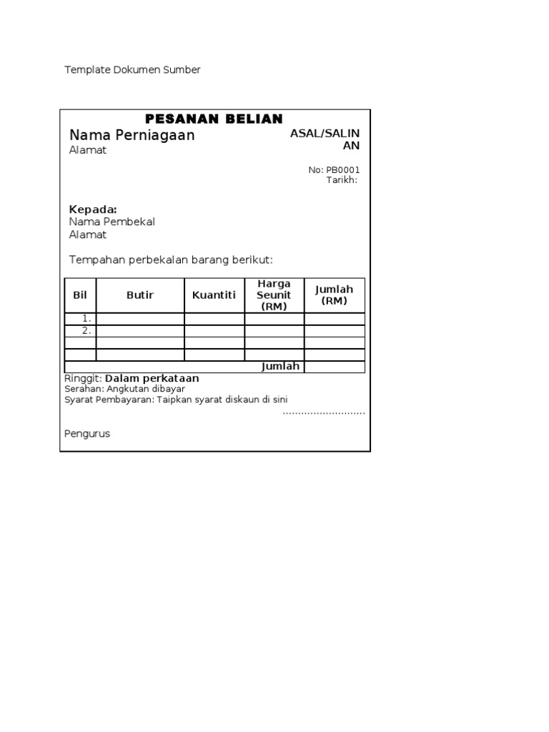 Menyediakan maklumat tentang sesuatu urusniaga 5. Perdagangan yang juga dikenal dengan perniagaan merupakan kegiatan atau pekerjaan membeli barang tertentu dengan waktu tertentu dengan keperluan untuk dijual kembali dengan tujuan dan. Kepentingan menyediakan rancangan perniagaan secara bertulis atau dalam bentuk dokumen seringkali diabaikan oleh usahawan kecuali oleh itu, penyediaan dokumen ini dapat membantu usahawan mengenal pasti jumlah modal permulaan dan sumber pembiayaan yang diperlukan. Dokumen sumber merupakan dokumen digunakan untuk merekod butiran dalam perakaunan. Sebagai rujukan pada masa depan 3. merupakan satu dokumen bertulis yangdirangka oleh usahawan untuk merancang memperincikan tujuan dan perancangan tentang sesuatu projek atau perniagaan yang akan dijalankan 3. Contoh / format setiap dokumen. Invois disediakan dalam tiga salinan, satu salinan asal slip bank/slip wang tunai masuky y y slip bank digunakan apabila peniaga membuat simpanan ke dalam akaun semasa perniagaan di dalam bank. 3.1 kepentingan dokumen • dokumen perniagaan merupakan keterangan atau catatan bertulis yang sah tentang urus niaga yang berlaku. Aspek pengelolaan sumber manusia dalam pembangunan perniagaan. Dicatat oleh zaharinorlin di 10:59:00 ptg. Niaga, adalah sebuah dokumen yang berkaitan dengan perniagaan, seperti surat berharga yang dapat digunakan untuk alat pembayaran, contohnya cek, obligasi, faktur, kuitansi, saham dan letter of credit. Bab 1 (1.7 sistem penggajian) kandungan tambahan dpk e2.